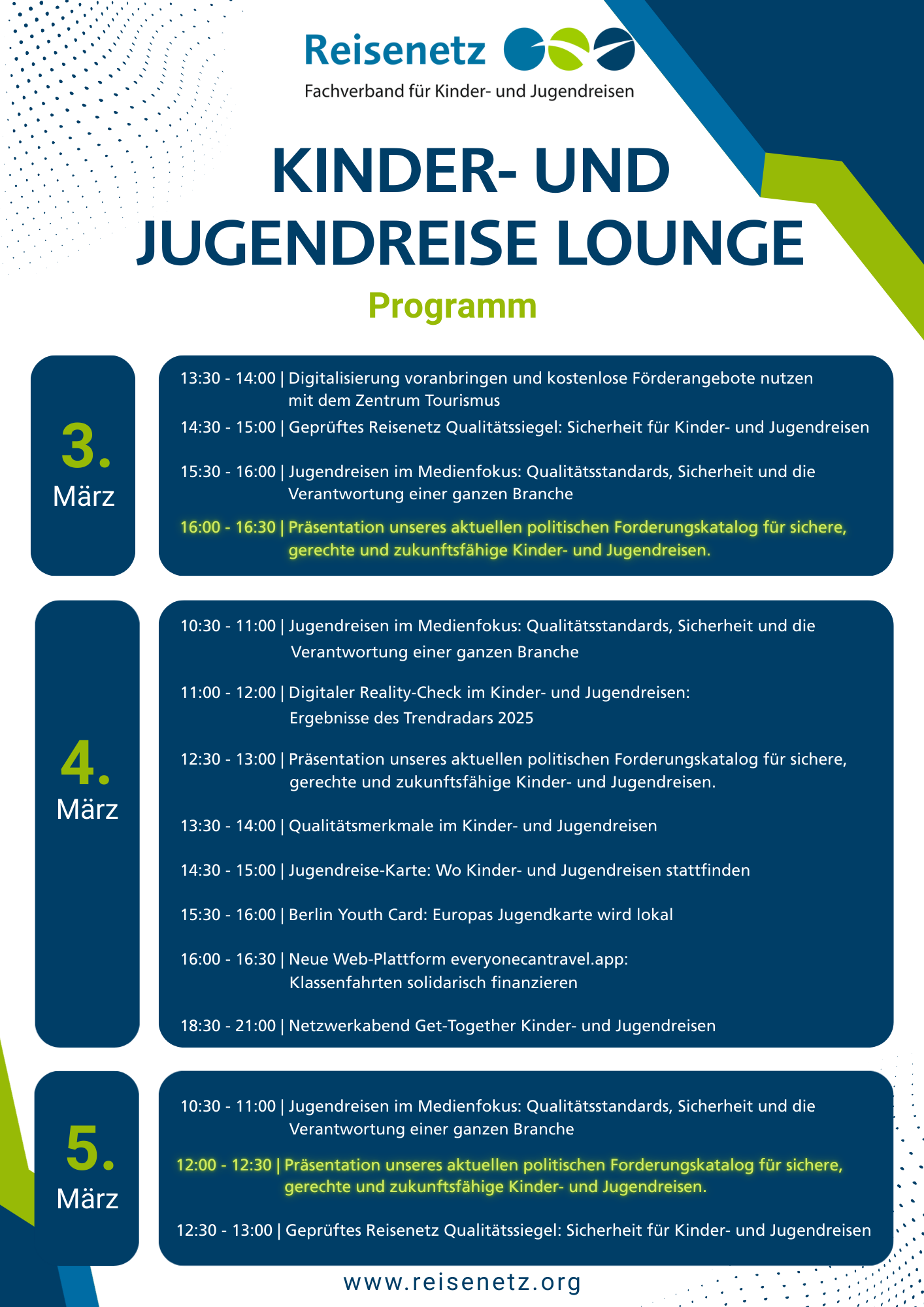 In der Kinder- und Jugendreise Lounge gibt es brandaktuelle Themen wie den Trendradar zum Kinder- und Jugendreisen, Informationen zu politischen Forderungen der Branche sowie einen praxisnahen Workshop zum Thema Qualität.